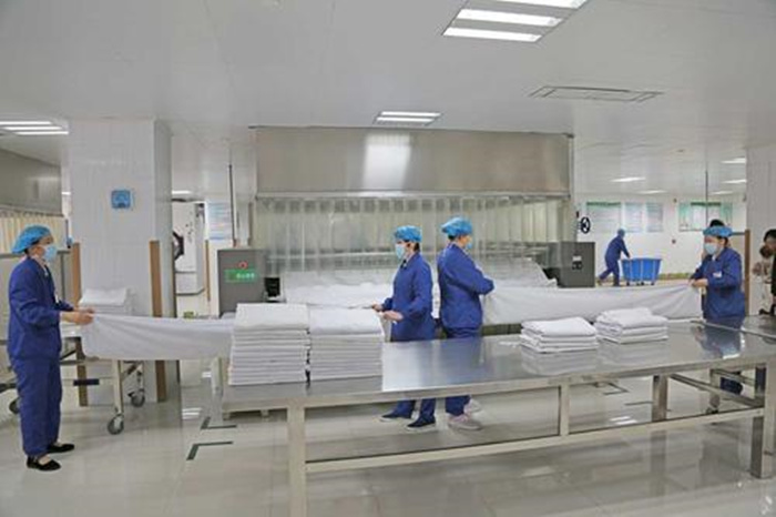 醫院的布草洗滌交叉感染是控制傳染的首要源頭,與賓館不同的是,布草在出醫院之前就要進行嚴格的分揀,要按照感染病和非感染病進行區分,此外,對于不同人穿的病號服也要進行分開,比如醫生和病人的制服,小孩子和新生兒的布草等都需要進行分散隔離包裝,最重要的一步是要進行消菌處理,并盡快進行清洗。洗滌前洗滌企業對醫院分揀過的布草按類別再行分揀,按布草質地、顏色、污垢類型、污垢程度等,均分開隔離洗滌。根據不同布草情況選用合適的洗滌劑洗滌。并且在清洗過程中,人流、物流、潔污分開。物流由洗滌區→烘干熨燙區→折疊區→潔凈布草存放區分別組成。臟污布草與潔凈布草操作人員嚴格分工,防止操作人員對潔凈布草的二次污染。